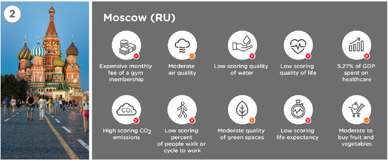 По каким критериям оценивали? Качество воздуха и воды, средняя продолжительность жизни, процент ВВП, идущий на здравоохранение, стоимость фруктов и овощей, уровень СО2, а также количество горожан, добирающихся на работу пешком и на велосипеде. Результаты, пишет канал «Новострой», для столицы России неутешительные. Канал сравнивает показатели со швейцарским Берном, занявшим третье место: на медицину у Москвы уходит 5,27% ВВП (в Берне — 12,2%), средняя продолжительность жизни — 72 года (швейцарцы живут на 12 лет дольше), вода и воздух тоже так себе, а на велосипедах или пешком в нашем городе на работу добирается лишь каждый четвертый (и это при том, что велодвижение в Москве сейчас на пике моды) — а в Амстердаме (он на восьмом месте) три четверти населения города.