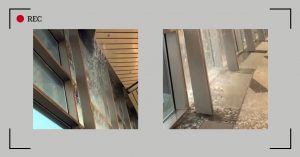 Первый в этом году тропический ливень повредил кровлю пассажирского терминала и полился водопадом внутрь здания. Мощные потоки воды стекают с потолка и перекрытий и по стенам добираются до зоны ожидания.