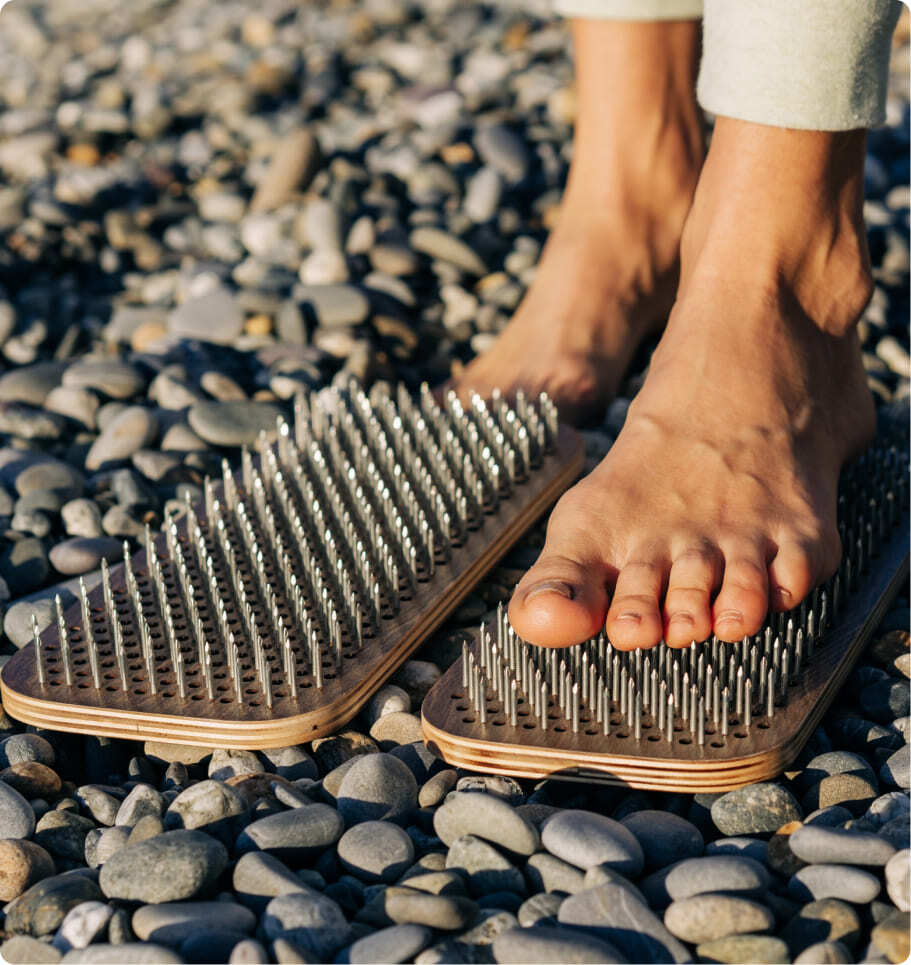 Принцип такой же, как в иглоукалывании: воздействие на определенные точки, связанные с внутренними органами. На стопах таких точек особенно много, а рефлексотерапевты говорят, что на них и вовсе расположена проекция нашего тела. Но даже если в теорию связи органов с определенными точками вы не верите, от гвоздестояния все равно есть эффект. Когда вы встаете на гвозди, в ответ на боль организм выбрасывает в кровь опиаты — обезболивающие, или гормоны счастья, которые дают мощный эмоциональный подъем. Плюс механическое воздействие: острые кончики вызывают покраснение кожи, расширение сосудов и прилив крови, что увеличивает скорость обменных процессов.