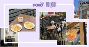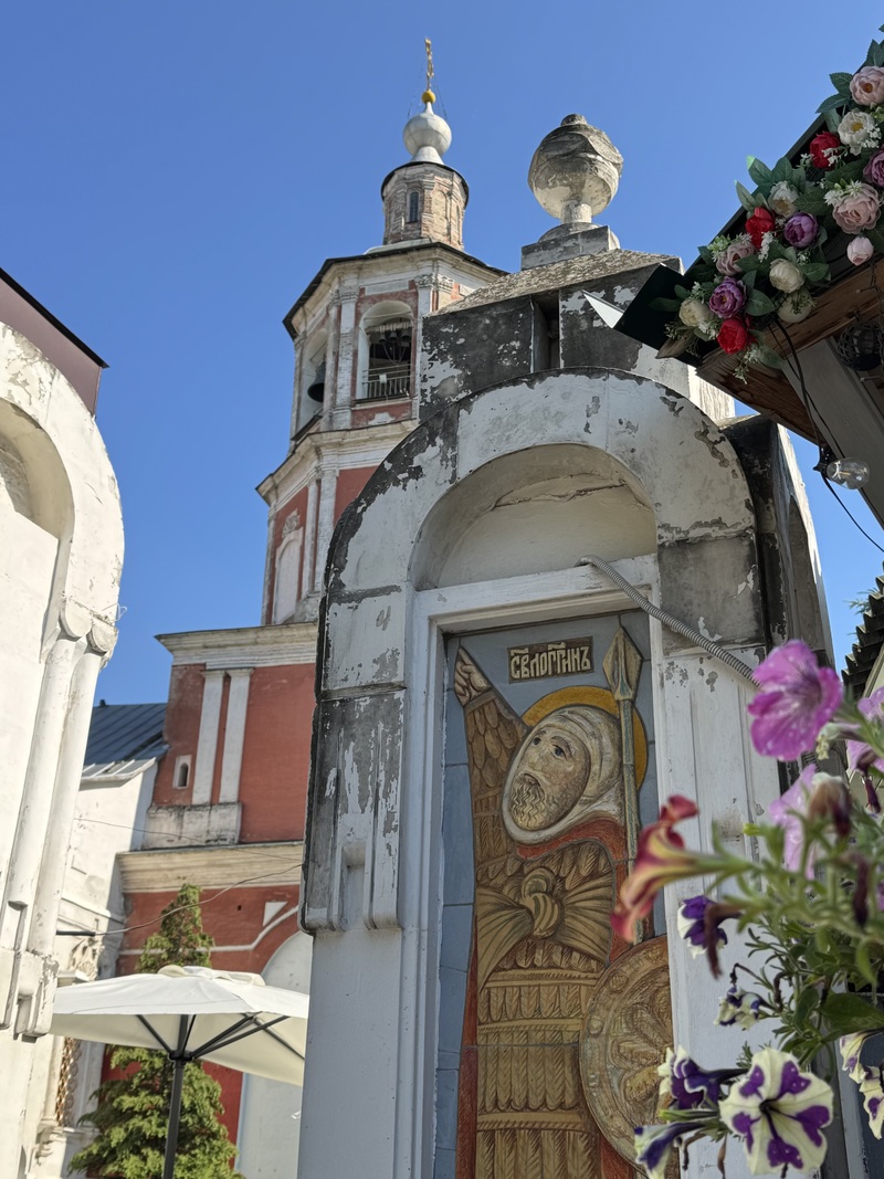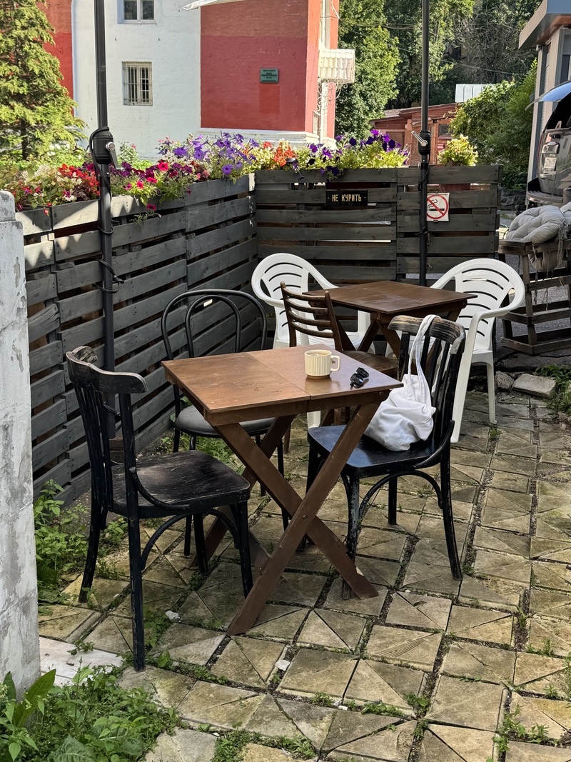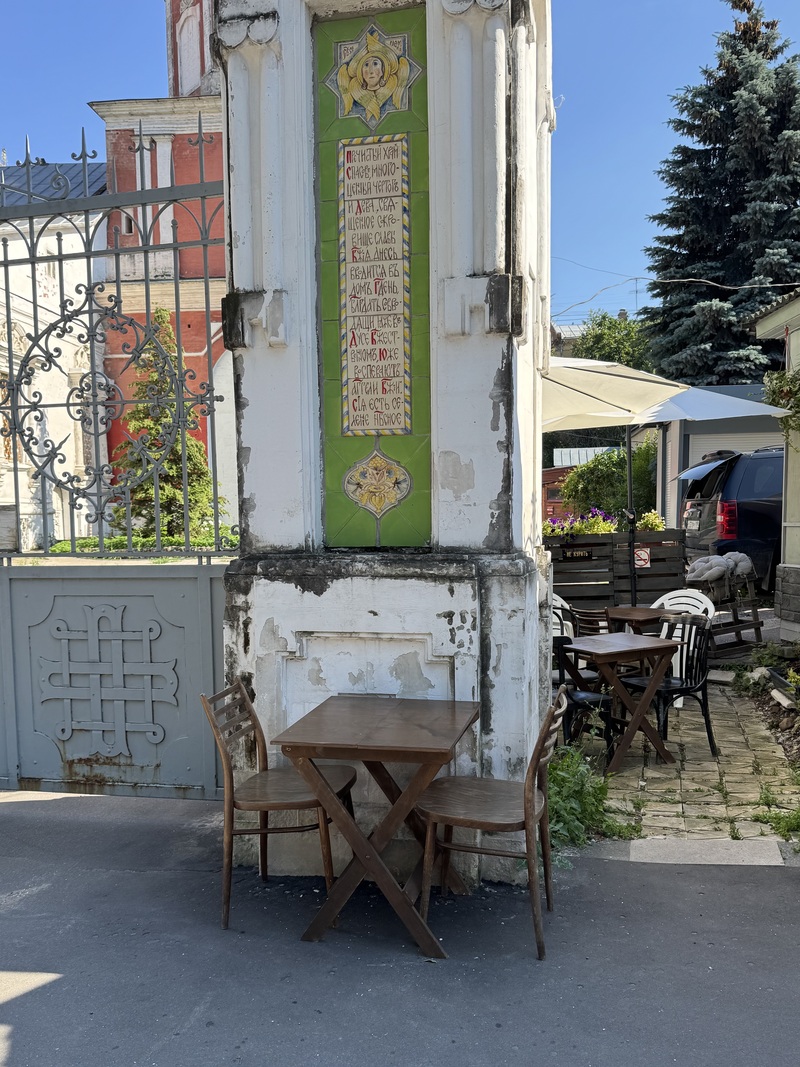 На крошечной веранде во дворе с видом на церковь два деревянных столика в узком проходе и один прямо у стены с росписью. Блинчики вынесли во двор и даже передали через забор — неожиданный, но очень теплый сервис.