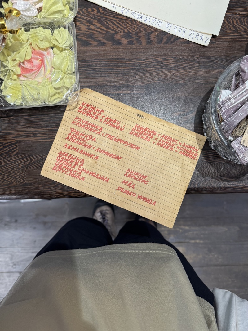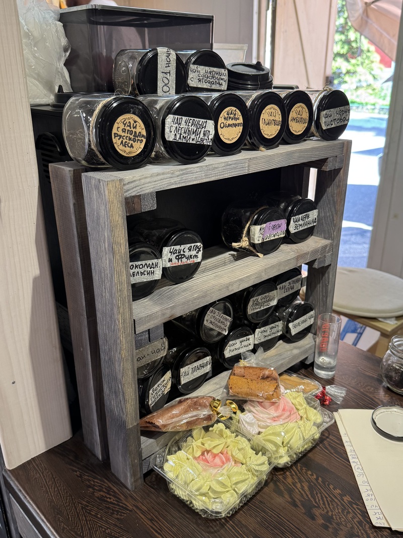 Впечатляет коллекция чаев, из которых можно подобрать пару к блинам. Есть и ставший классикой иван‑чай, и аутентичные вкусы вроде «Русского леса» или «1001 ночи», а также необычные ягодные сочетания. Я выбрал черный чай с клюквой (125₽) — получилось, как будто заедаешь крепкий чай с бергамотом ложкой ягодного варенья.