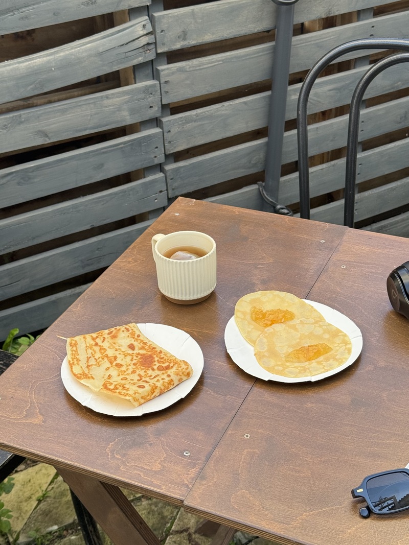 Оба блина — тонкие, поджаристые и чуть сладкие. Вариант с рикоттой оказался приятным и нейтральным — сыр, как и положено, практически безвкусный, зато создает мягкую текстуру. А вот сочетание с лимонным вареньем меня искренне поразило: джем с кусочками мякоти и цедры настолько яркий и вкусный, что я бы съел еще несколько порций.
