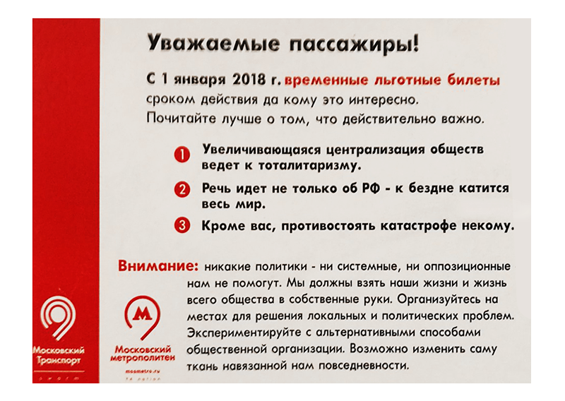 Неизвестные активисты выпустили стикеры с прокламациями, стилизованные под официальные объявления Московского метрополитена.