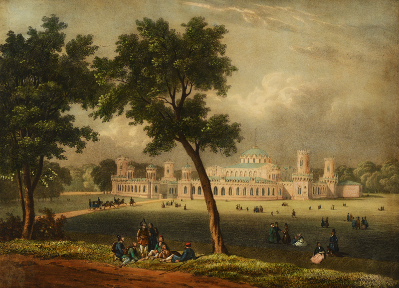 Петровский подъездной дворец. г. Москва. Общий вид со стороны дороги. 1840-е гг. Гравер: Хоштейн Э., Архитектор Казаков М.Ф.,