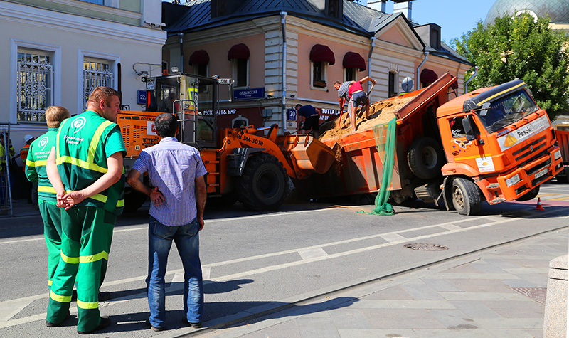 Всю первую половину дня 24 августа выходящих из метро «Третьяковская» ждало эффектное зрелище — большой самосвал с песком, минимум на четверть ушедший под землю, и его водитель, философски взирающий на происходящее.