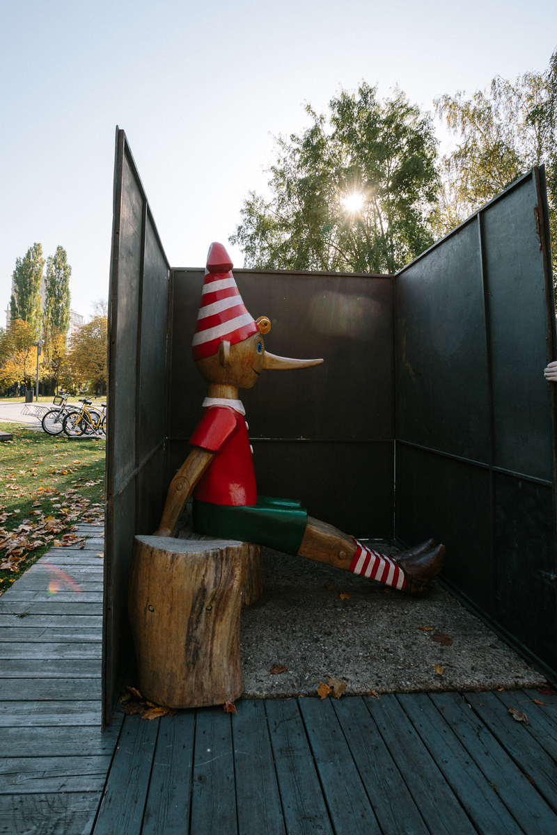 На самом деле, для Буратино так лучше: деревянная скульптура за зиму может рассохнуться и пострадать от перепада температур, а в коробе она в безопасности. Идею с фанерными ящиками Музеон позаимствовал у петербургского Летнего сада: «Амур и Психея» каждый год отправляются в коробку и прекрасно себя чувствуют.