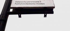 «Остановка перенесена к Политехническому музею — Ostanovka perenesena k Politehnicheskomu muzeyu» — написано на указателе.