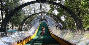 Парк находится в районе между «Новослободской» и «Цветным бульваром» — рядом с Музеем декоративно-прикладного искусства, еще он называется «Щемиловский детский парк». Тут батуты, качели всех мастей, высокая травяная горка, с которой дети съезжают, как со снежной, тарзанки, на которых качаются взрослые — папы, пришедшие с детьми. Их можно понять, в нашем детстве такого не было.