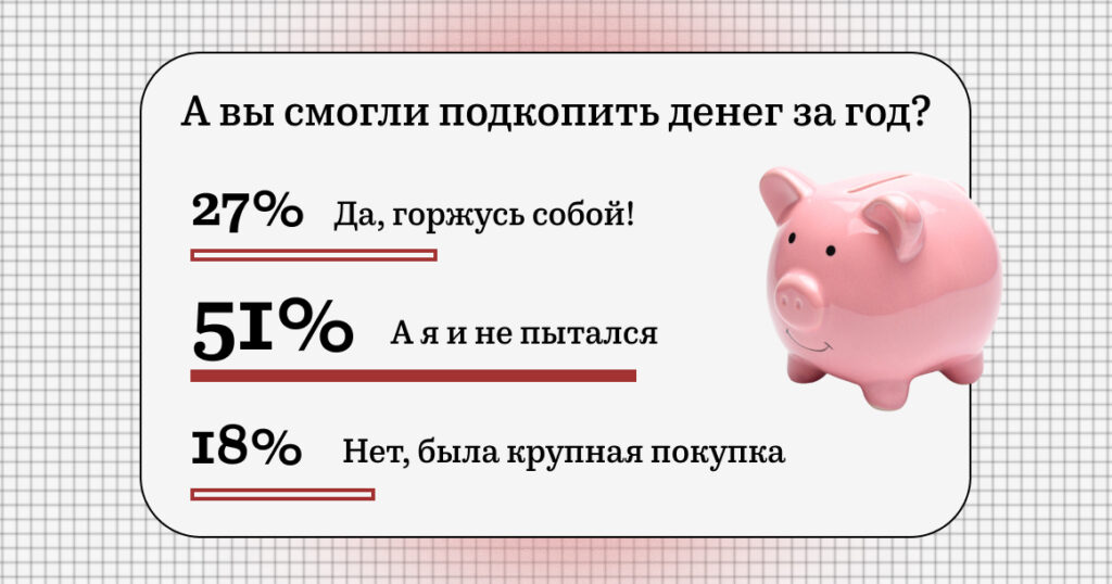 27% респондентов на вопрос «А вы смогли подкопить денег за год?» (имеется в виду 2025-й) ответили: «Да, горжусь собой!». Еще 18% признались, что накопить не получилось из-за крупной покупки. Но безоговорочное большинство выбрало вариант «А я и не пытался».