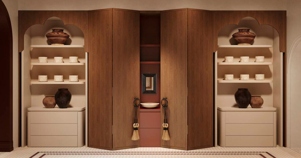 Интерьер «Соловьев» — отдельный разговор. По визуализациям бани выглядят как смесь новой русской эстетики — без откровенных «лаптей» — и премиального курортного спа. Много теплого дерева, округлой мебели, текстиля и приглушенных оттенков — бежевого, молочного, терракотового. Полы с узорчатой плиткой, арки с орнаментами, плюс изразцовая печь — пожалуй, главный интерьерный герой пространства. Встречаются картины, декоративные светильники и арт-объекты, которые, видимо, должны помогать входить в это состояние особенного ритуала.