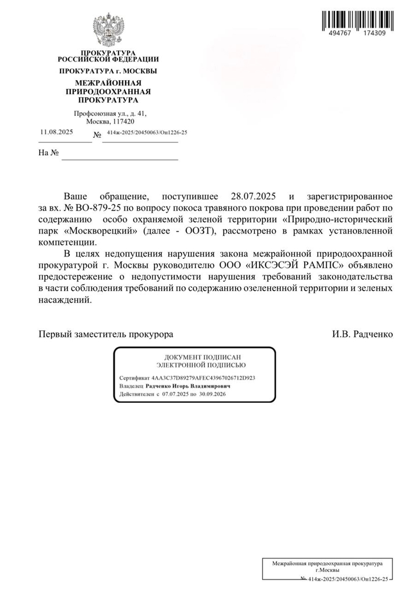 Сегодня телеграм-канал «Главное: Защитим Крылатские Холмы» опубликовал ответ на обращение общественного инспектора Росприроднадзора в межрайонную природную прокуратуру. Обращение касалось вырубки кустарников на территории «Крылатских холмов». Работы, по словам активистов, велись без порубочного билета и информщита, хотя по закону это обязательные условия.