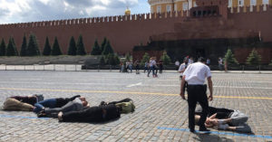 Пролежать у акционистов получилось недолго — на видео, опубликованном в телеграме канала «Дождь», видно, как несколько молодых людей ложатся на брусчатку, а через 30 секунд к ним подходят полицейские со словами «Встаем, молодые люди!». Часть активистов подняли силой. Всех восьмерых участников хеппенинга задержали.