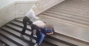 Из-за чего поругались пассажиры, неизвестно. Но в прокуратуре сообщают, что спор возник между мужчинами, а женщина — спутница нападавшего — подключилась к драке позднее. На кадрах с камеры наблюдения видно, что мужчина в белой футболке сначала нагнал своего противника в конце лестницы и схватил его на одежду. Оппоненты вместе скатились по лестнице вниз, и только тогда к избиению подключилась подоспевшая спутница разбойника — блондинка с сумочкой. Правда, своим модным аксессуаром она наносила удары не только противнику, но и партнеру тоже. В сумке, как уточняет прокуратура, лежала бутылка с алкоголем.