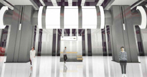 Как вы уже, наверно, догадались, для «Бачуринской» в качестве доминанты выбрали супрематизм — асимметричные формы, построенные на сочетании простых геометрических фигур. В отделке будут использовать камень различных оттенков светло-серого, черного и красного, а также реечные конструкции и нержавеющую сталь. На стенах и потолках заглубленные глянцевые поверхности с рисунком будут чередоваться с выступающими матовыми алюминиевыми панелями.