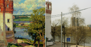 Изображенный на картине «Новодевичий монастырь. Башни» участок древней православной святыни — место, где Москва превращается в Иерусалим, а мятежная царевна — в святую. Но гораздо интереснее пейзаж правой части полотна. Деревянные домики у воды — одно из немногочисленных свидетельств о маленькой деревне, память о которой исчезла под сваями стадиона в середине XX века.