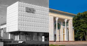 Павильон №15 «Радиоэлектроника и связь» («Поволжье»): с модернистским фасадом 1958 года и в момент проведения реставрационных работ.
