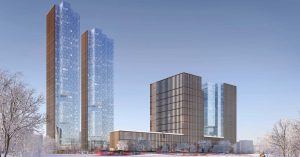 Бюро Сергея Скуратова на днях показало конкурсный проект, который архитекторы готовили для этой территории. В нем указано, что одной из целей было создать контраст высотных башен апартаментов с «пониженной офисной частью». Кажется, это сделать получилось. Разработаны разные варианты фасадов, но общая концепция и плотность застройки остаются такими же. Какова судьба скуратовского проекта, пока не известно.