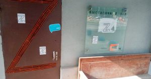 На кадрах видно, что патриотические символы разместили на здании выставочного зала — несколько небольших наклеек с надписью «Поддерживаем наши войска» видно на стекле у входа и двух дверях, на каждой из которых также появилась большая буква Z в цветах георгиевской ленты. Кто именно обклеил ими двухэтажку — неизвестно.