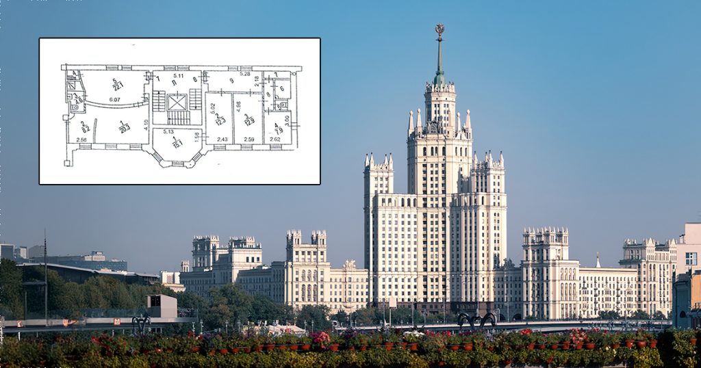 На ЦИАН появилось объявление о продаже части здания на Котельнической набережной, 1/15б — это как раз высотка. За 750 млн рублей предлагают купить 872,6 «квадрата» — это сразу десять квартир, по две на каждом этаже с четвертого по восьмой, пишет ТАСС.