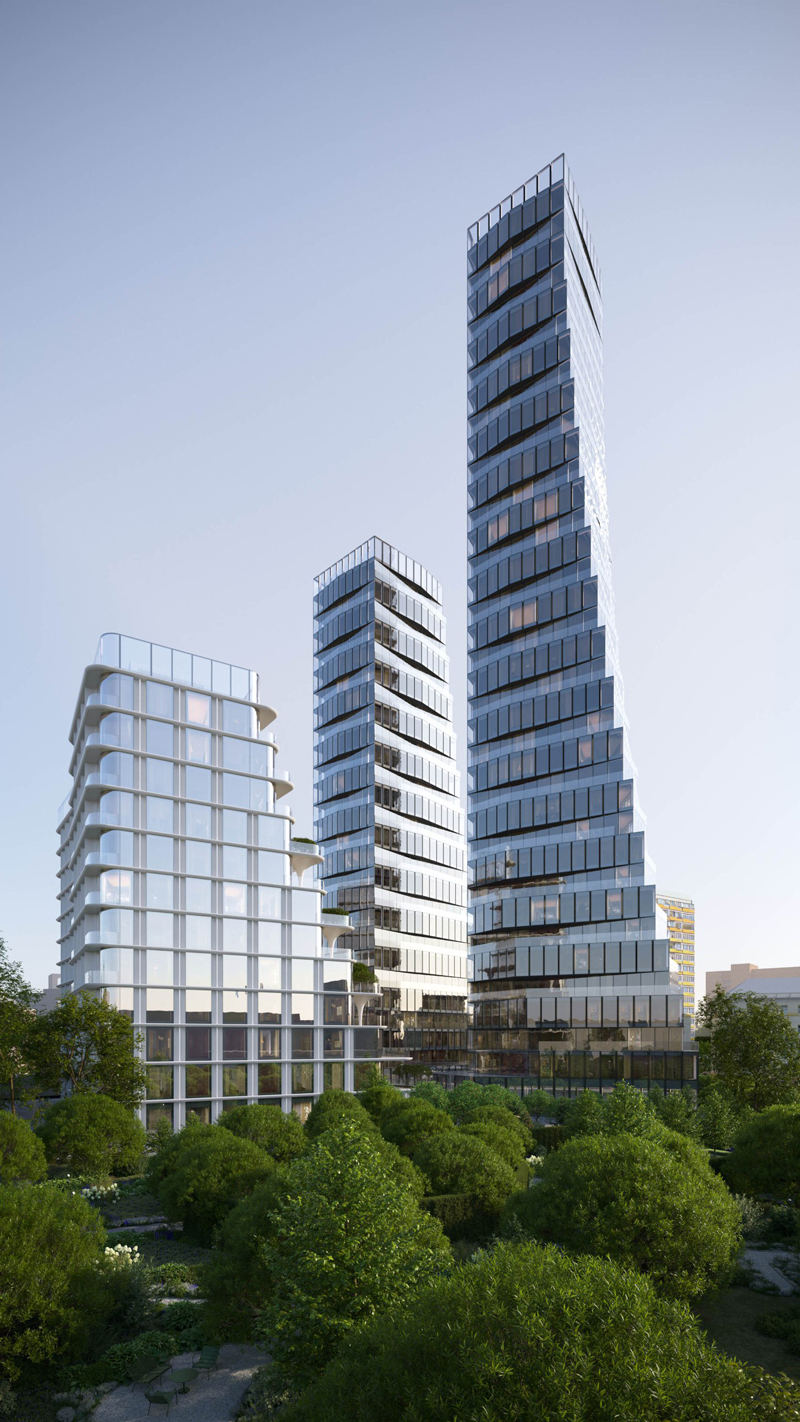 Там появится комплекс жилых башен высотой от 5 до 36 этажей, рассчитанный на 239 квартир. Собственно рельеф будет создавать асимметричное разноуровневое остекление. Благодаря ему, судя по рендерам, фасады будут казаться изогнутыми с любой стороны и во всех трех измерениях.