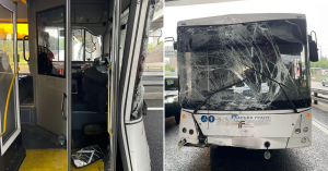Столкновение произошло накануне вечером под мостом на пересечении шоссе и МКАД. По данным ГАИ, водитель автобуса ПАЗ перестраивался в крайнюю левую полосу и не уступил дорогу другому автобусу МАЗ, который ехал в попутном направлении