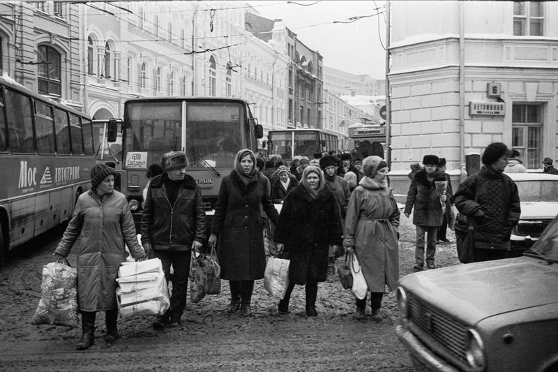 «Бытовая и хозяйственная жизнь города казалась замершей, — рассказывает Дмитрий Борко. — С середины восьмидесятых нарастал долгострой. В центре, где я жил, многие старые дома в предыдущие годы выселили, начав какую-то программу реконструкции, но она замерла, и в моих сретенских переулках, казалось, половина домов зияла пустыми или забитыми окнами. Коммунальные службы тоже приходили в упадок. Я помню заваленные снегом тротуары с крошечными протоптанными тропками, переполненные мусорные баки и груды мусора на улицах. В 1991-м “помоечность” Москвы достигла апогея, но и в 1990-м город уже начинал напоминать картины апокалипсиса.