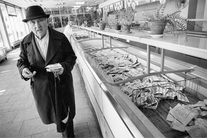 «Однажды я снимал, как в зал большого пустого универсама грузчики вдруг стали выкатывать тележки с какими-то плотно запечатанными упаковками, — вспоминает Дмитрий Борко. — Стоявший в очереди неизвестно за чем народ, позабыв о занятых местах, рванул к тележкам и, толкаясь, стал яростно разрывать упаковки, бросая бумагу на пол. Оказалось, что внутри пачки соды. Люди хватали по 10–15 пачек, совершенно не думая, зачем им это. Помню, что все прилавки были заполнены банками с дальневосточной морской капустой и чем-то еще, столь же случайным и бессмысленным. Макароны, кажется, все же были, их я тогда и ел в основном».