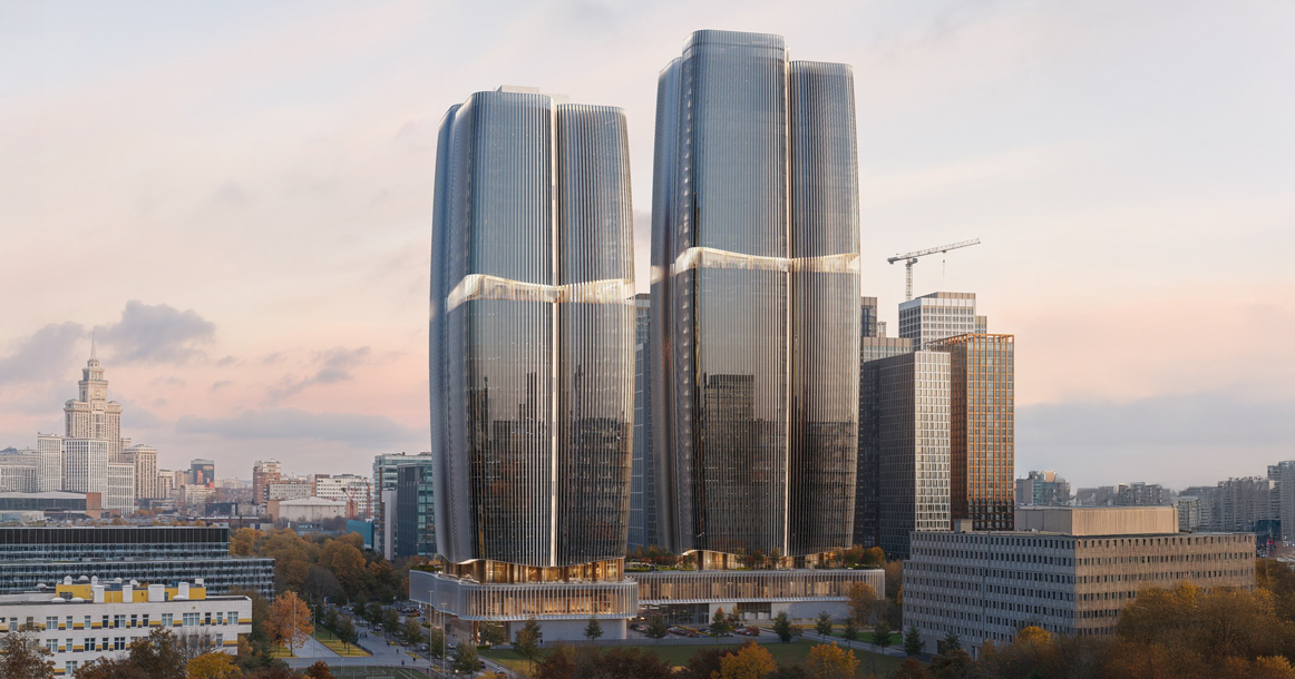Обе высотки будут слегка выпуклой обтекаемой формы. Примерно чуть выше центра они разделены полностью застекленным этажом, который формирует динамичную линию и задает ритм всей архитектурной композиции. Сами небоскребы сложной формы — каждая башня состоит из нескольких как будто слившихся частей.