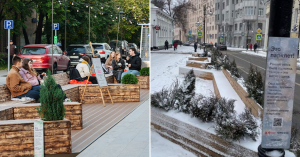 Места для отдыха и еды на месте парковочных карманов впервые разместили в этом году по просьбе активистов. И оставили на зиму в отличие от летних веранд.