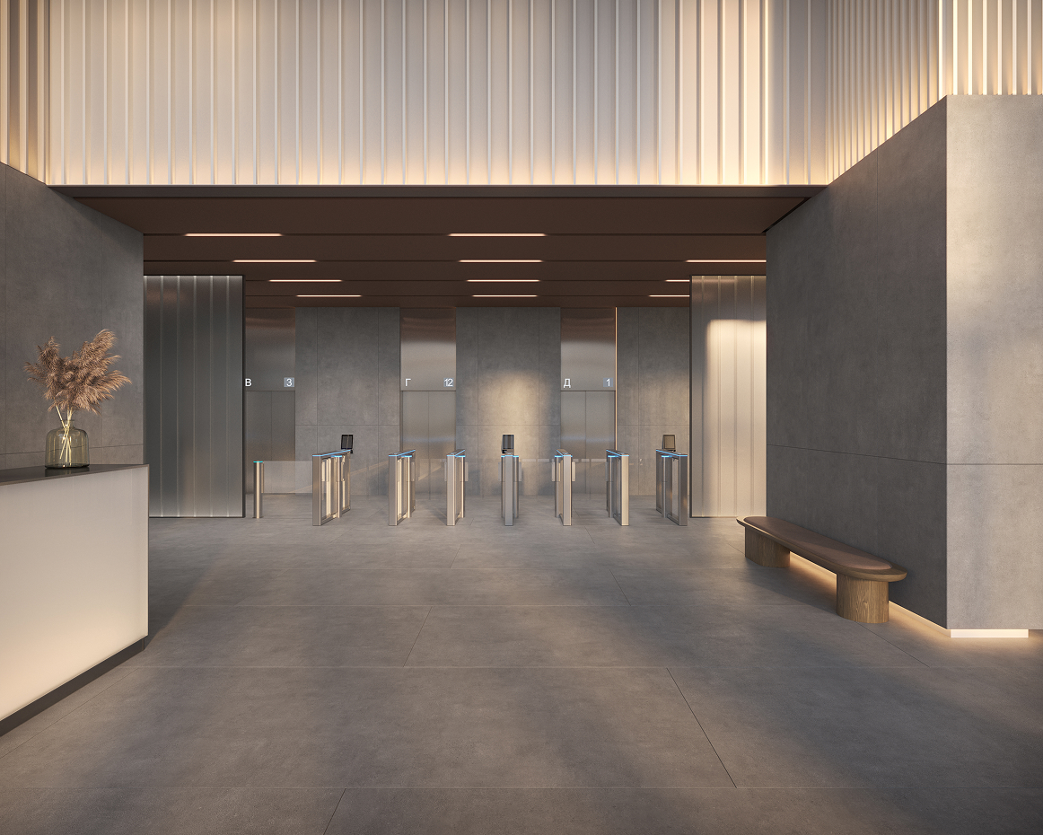 В основу интерьерной концепции легла идея движения воды и метафора корабля, заданная фасадом здания. Для лобби выбрали мягкую гамму серых оттенков с нюдово-бежевыми акцентами, а второй свет решили отсечь «ватерлинией», чтобы сформировать образ горизонта. В светильниках, потолочных панелях и мебели также будет обыграна тема кораблестроения и культуры парусного спорта. Дерево используют точечно, в зонах ожидания, где оно добавит тепла в сочетании с металлом и сдержанной серо-пудровой палитрой.