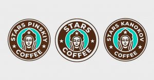 На логотипе нашего обновленного Starbucks изображена девушка в кокошнике со звездой (только не во лбу, а на головном уборе). Названия такие: Stars Pinskiy Coffee, Stars Kanokov Coffee и Stars Coffee. Самое логичное из них — последнее, поскольку на логотипе изображена девушка со звездой на кокошнике. А вот с остальными названиями логотип не сочетается: почему на лого кофейни с мужскими фамилиями в названии (Пинский или Каноков) изображена девушка, не совсем понятно.