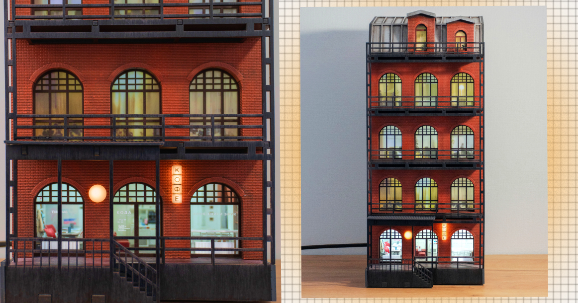 Ночник, судя по тому, что рассказывают авторы коллаборации, продуман в деталях. У него несколько режимов освещения: можно подсветить только первый этаж или включить весь корпус целиком. Высота объекта — 40 сантиметров. Внутри, если присмотреться, легко различить детали офисной жизни: ноутбуки на столах, кофемашину, одежду на вешалках. Кофейня «Кода» на первом этаже, кстати, существует и в реальности — это часть офиса, открытая для всех.