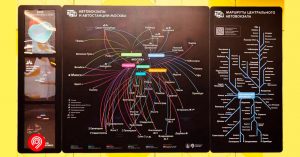 Кажется, если показать эту схему туристам из других регионов, они окончательно запутаются (что уж говорить, не каждый москвич знает, где все эти вокзалы расположены). На схеме обозначены точки — автовокзалы, а также популярные пункты назначения, как будто огни взорвавшегося фейерверка.