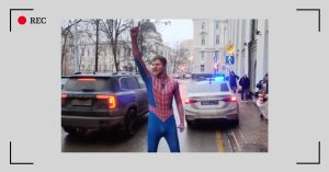Как поясняется в канале художника Романа Яковлева, в костюм Человека-паука облачился его соратник по «Тайному обществу художников» Алексей Неzемной, который «попытался красиво исчезнуть, как в фильмах». В итоге отважного «разоблачителя» задержали сотрудники правопорядка.