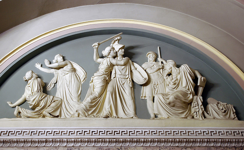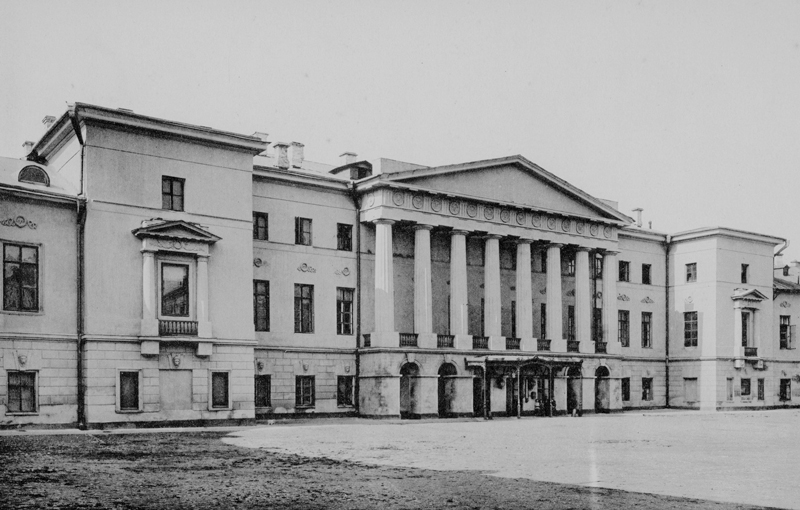 К имеющемуся дворцу зодчий пристраивает два боковых крыла, тем самым создавая симметричную композицию, характерную для зрелого классицизма, делая еще более грандиозным это красивое здание. Фасад приобретает украшение в виде восьмиколонного дорического портика и лепного декора с масками молчаливых львов, медальонами, жезлами, обвитыми плющом, головами горгоны Медузы.