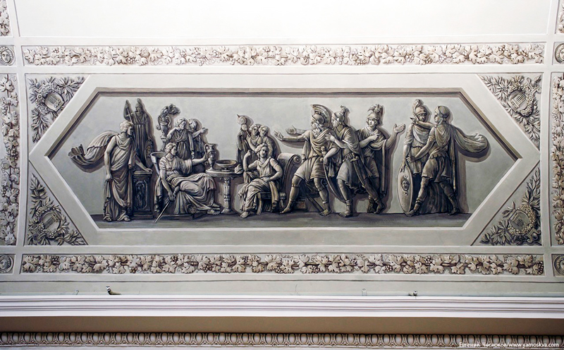 Внутренне убранство потрясало роскошью, которая ныне восстановлена. Мраморные колонны поддерживали сводчатый потолок и плафон, покрытый росписью на мифологические сюжеты. В центре были изображены музы — Урания, Полигимния и Клио, обрамленные лепниной и живописью в технике гризайль (тоновые вариации одного цвета имитируют объем). К счастью, время сохранило и мраморные лестницы с коваными решетками.