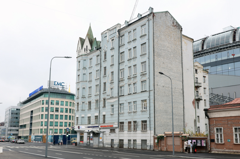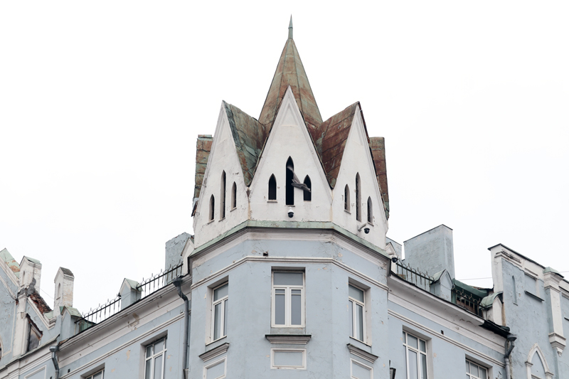 Для шестиэтажного (чуть ниже первого тучереза) здания на Мещанской автор избрал неоготический стиль. Главный фасад украсил четырехгранным эркером, увенчал башней с изящной стрельчатой короной. Треугольный аттик, фланкированный подобием фиалов, подчеркивающих устремленность ввысь, выступает здесь за линию фасада.