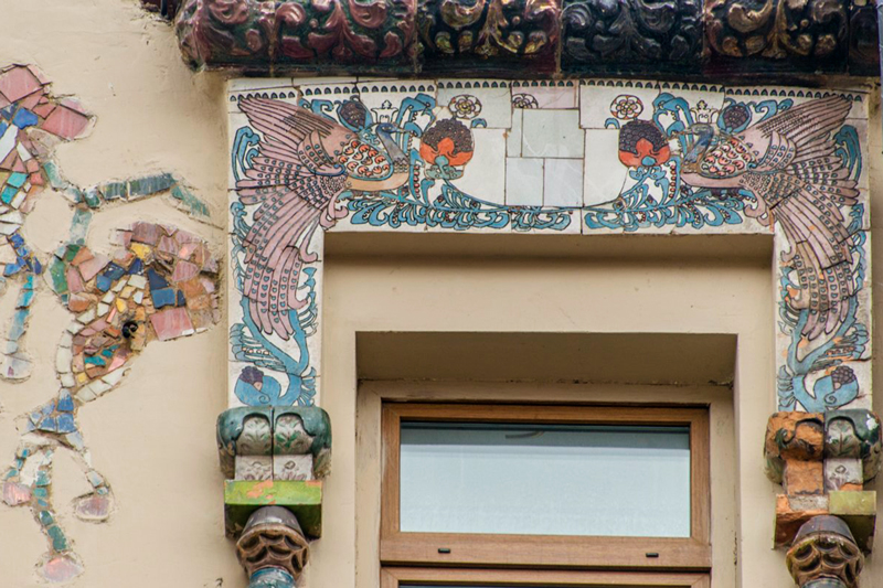 Сказочные птицы с красочными крыльями и хвостами, окруженные узором, точно на книжные заставки, тут как нельзя кстати. Их две пары и они довершают композицию фасада.