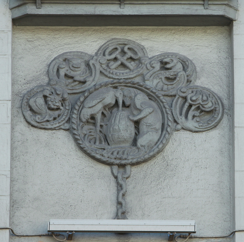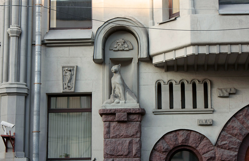 Возвращаемся на Полянку. Две львицы с каменными улыбками из ниш глядят на прохожих. Одна из них кормит львенка. Возможно, львенок имелся и у второй, но со временем «исчез» в неизвестном направлении. Над хищницами, попирающими гранитные постаменты, висят зловещие маски почему-то ацтеков. На эркерах различимы рельефы с ящерицами. И все же для изучения всего здешнего готического бестиария пытливому зрителю потребуется бинокль.