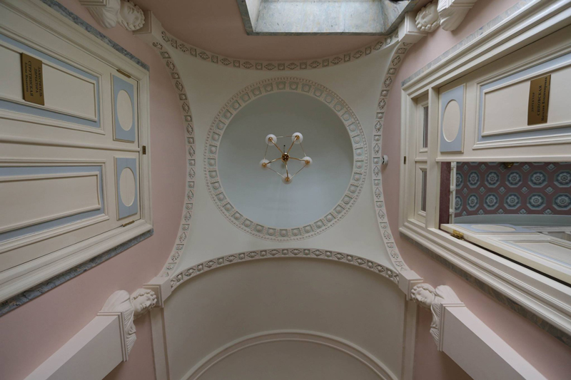 К особняку в Козицком переулке при бригадирше Лобковой пристраивается узкий двухэтажный жилой флигель и делается проезд во двор. Над этим проездом, ныне являющимся арочным входом в здание, для Анны Ивановны помещается уютная диванная, смахивающая на беседку, перекрытая овальным кессонированным сводом на легких ионических колоннах и украшенная полукруглыми нишами.