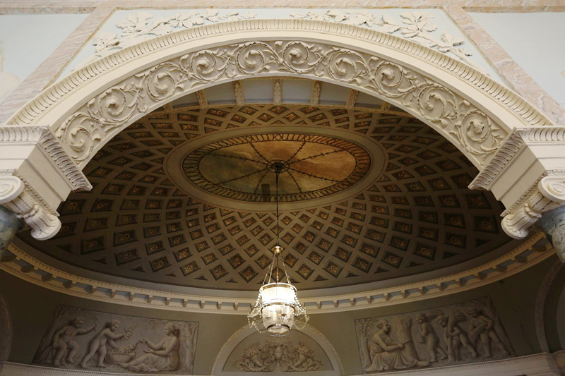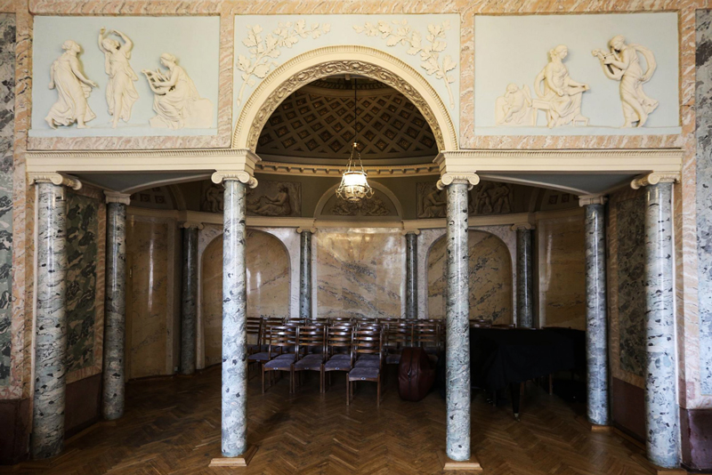 В доме устраиваются вестибюль и гардеробная для гостей. Интерьер дома богато декорируется искусственным полированным мрамором, росписью в технике гризайль и великолепными лепными барельефами на античные сюжеты. В гостиной, где был приспособлен балкон для оркестра, давались балы.