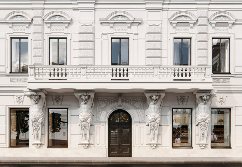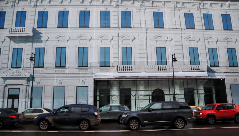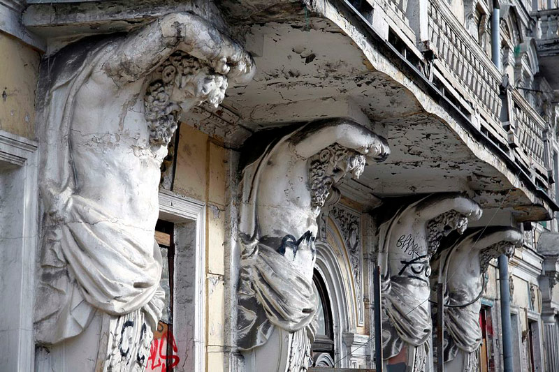 Процесс начался с противоаварийных работ. В декабре ширма с фальшфасадом слегка приоткрылась. За стеклянной витриной, как в роскошном бутике, перед прохожими предстали четыре могучих атланта, держащих балкон второго этажа на своих каменных руках, казалось бы, приведенные в порядок, но, по мнению некоторых градозащитников, больше смахивающие на новодел.