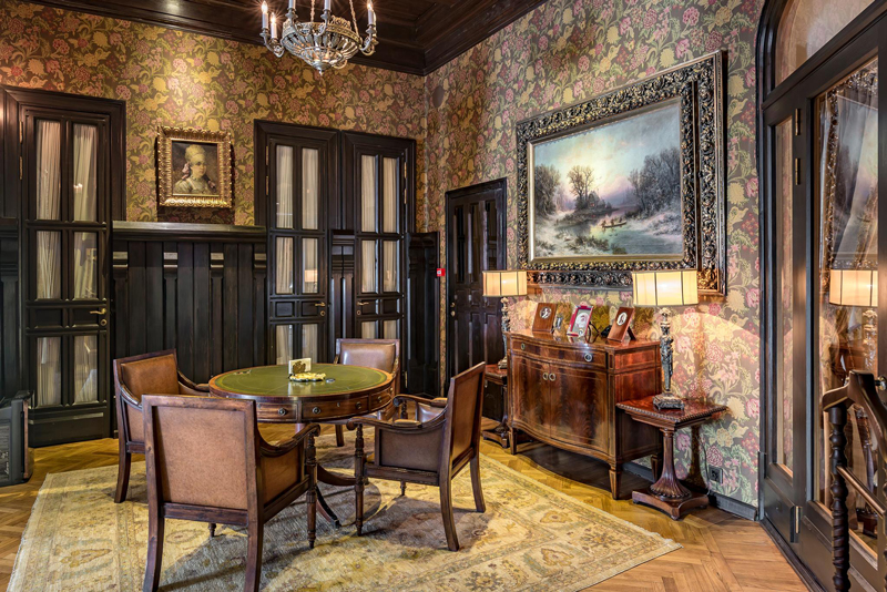 Внутреннее убранство Бойцов интерпретировал в сугубо готическом стиле со всем его тезаурусом — остроконечными пинаклями, цветными витражами, стрельчатыми порталами, винтовыми лесенками, потайными дверцами и, разумеется, резным камином. В отделке стен и кессонированных потолков было отдано предпочтение дубу и ореху. Надо ли говорить, что вся мебель тут выполнена по рисунках Бойцова на фабрике Шмидта? Увы, князь Борис Владимирович не успел в полной мере насладиться своим владением. В августе 1890 года Святополк-Четвертинский внезапно скончался. Вскоре вдова и ее дочери через аукцион продают недвижимость графине Александре Андреевне Олсуфьевой, статс-даме императрицы Марии Федоровны, гофмейстерине великой княгини Елизаветы Федоровны, жене генерала от кавалерии, известного филолога Алексея Васильевича Олсуфьева.