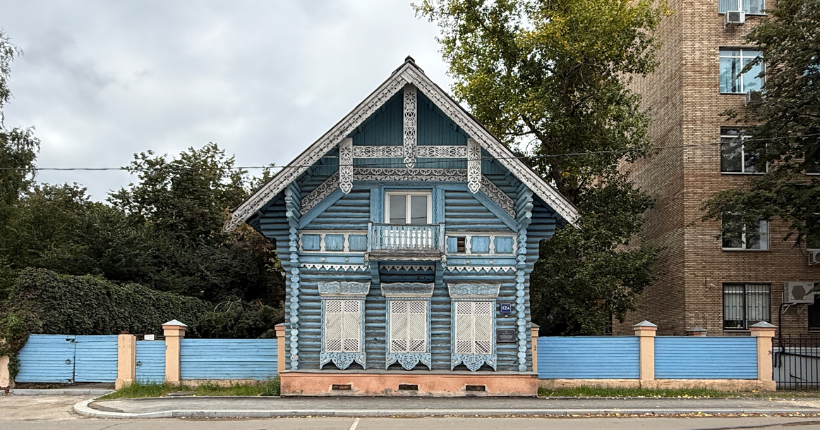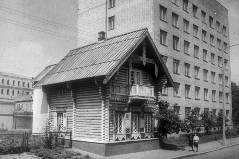 После наполеоновского пожара Москва, прежде деревянная, стала интенсивно отстраиваться каменными домами. Интерес к традиционному деревянному зодчеству вновь возник к середине века на волне дискуссий о национальном стиле, когда общественную мысль обеспокоил животрепещущий вопрос самоидентификации русского, проблема исторического будущего России с ее особым, неевропейским путем развития. Москва, разумеется, воспринималась как центр национальной культуры. Своеобразным манифестом идейного движения стал сруб из теса размером 11,9×6,5 м, сработанный «в обло», установленный на кирпичный фундамент, пышно украшенный ажурной резьбой, балконом и декоративным дымоходом у конька.