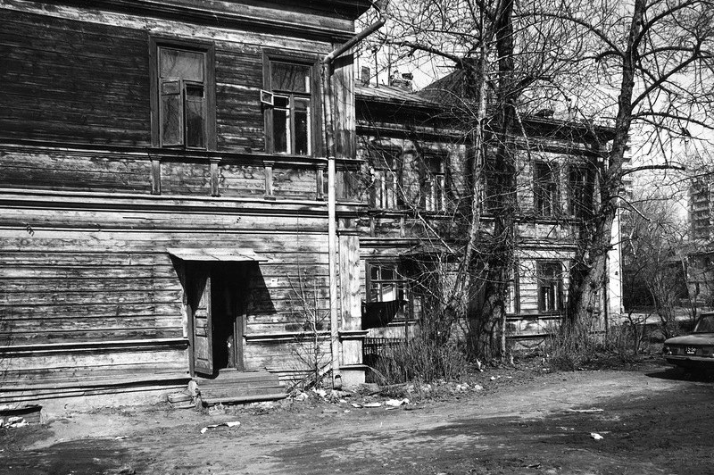 Огороженное железной решеткой с заколоченными окнами здание с двух сторон зажато каменными новоделами.