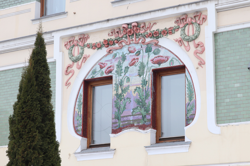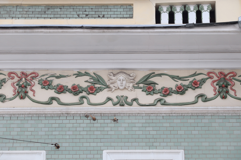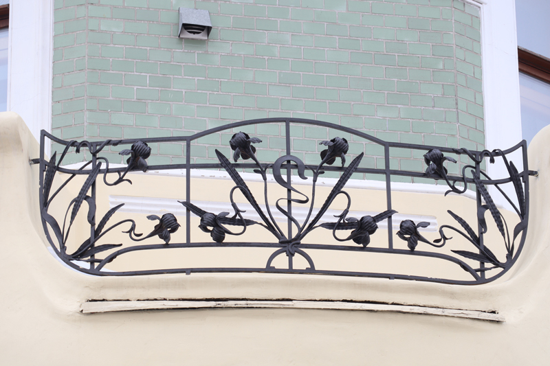 Разумеется, Дмитрий Федорович Беляев стремился соответствовать архитектурной моде и выбрал для своего жилища стиль модерн. Но, видимо, условия были таковы, что за основу нового объема пришлось брать ранее существовавший двухэтажный параллелепипед с ритмом одинаковых окон. Однако со стороны сада все же удалось найти место и реализовать восьмигранную пристройку к дому с балконом и карнизом. Далее авторы проекта с наслаждением занялись украшением фасадов, первым делом облицевав внешние стены здания глянцевой керамической плиткой серо-зеленого, характерного для модерна, оттенка. Пара окон, выходящих в сад, была заключена в полуовальную рамку. В ее плавных контурах поместили изысканное мозаичное панно, изображающее спускающийся с небес закат и грядку с маками, символами сна и забвения. На изогнутых стеблях покачиваются зеленые бутоны и алые, уже вовсю раскрывшиеся соцветия. Вдоль всего фасада протянута линия декоративного лепного рельефа в виде ветвей цветущей сакуры и многократно повторяющихся масок прекрасной Лорелеи с золотистыми волосами. В кованых перилах балкона, обнимающего восьмигранную пристройку, узнаются головки ирисов и тюльпанов, любимых цветов стиля модерн. Козырек над входом прежде поддерживали кованые деревца, но они, увы, были утрачены.