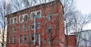 Этот четырехэтажный объем отличается разнообразием окон и видов расстекловки. Для каждого этажа выбрана своя форма — узкое стрельчатое окно, окно полукруглое, прямоугольное, сдвоенное. Фасады обнимает декоративный кирпичный фриз. Автор проекта, имя которого история, к сожалению, до нас не донесла, обладал большой фантазией: в здании не найти двух одинаковых фасадов.
