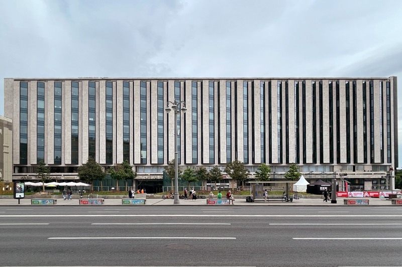 Изначально предполагалась 12-этажная башня, но по генеральному плану 1926 года близ Страстного бульвара нельзя было строить выше шести этажей. Башню убрали, в работу взяли вариант «кубистического» шестиэтажного здания с «квадратным» фасадом.