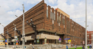 Здание доронинского МХАТа на Тверском бульваре, 22, для театральной традиции стало своего рода революцией. На место веками намоленных форм святилища Мельпомены, колонного портика под фронтоном, обильно украшенного лепными аллегориями, пришел глухой модернистский фасад. Горизонтали шершавой облицовки коричнево-красного армянского туфа, террасно сползающие по поверхности, по замыслу автора, должны были напоминать складки театрального занавеса. Точно скрепками, их держат мощные кронштейны темного металла с фонарями. Это была попытка скульптора Андрея Васнецова процитировать светильники исторического здания МХАТа в Камергерском по рисунку Федора Шехтеля. Бра украшены барельефами с музами трагедии, танца, музыки и комедии. К бульвару от театрального подъезда спускаются ступени из грубого камня.