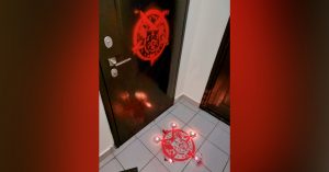 Пентаграммы со свиными головами появились на входной двери военкора, а также на полу возле нее, где еще были расставлены свечки. Это уже третий случай устрашения свиными головами. О первом стало известно в конце сентября — настоящую свиную голову нашел на пороге своей квартиры обозреватель «России сегодня» Тимофей Сергейцев. На следующий день свиную голову обнаружили у двери военного эксперта Константина Сивкова. Но с Трушниным пока первый случай, когда ни одна свиная голова не пострадала — только появился символ.
